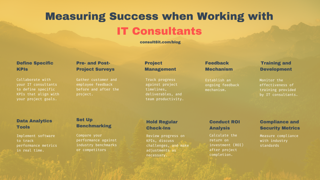 Once you’ve engaged IT consultants and your project is underway, it’s essential to measure their impact effectively. Establishing clear Key Performance Indicators (KPIs) allows you to assess whether your investment is yielding the desired outcomes. Here’s how to set the stage for success: