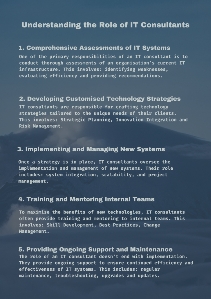 IT consultants serve as integral partners within organisations, taking on a variety of responsibilities that include: